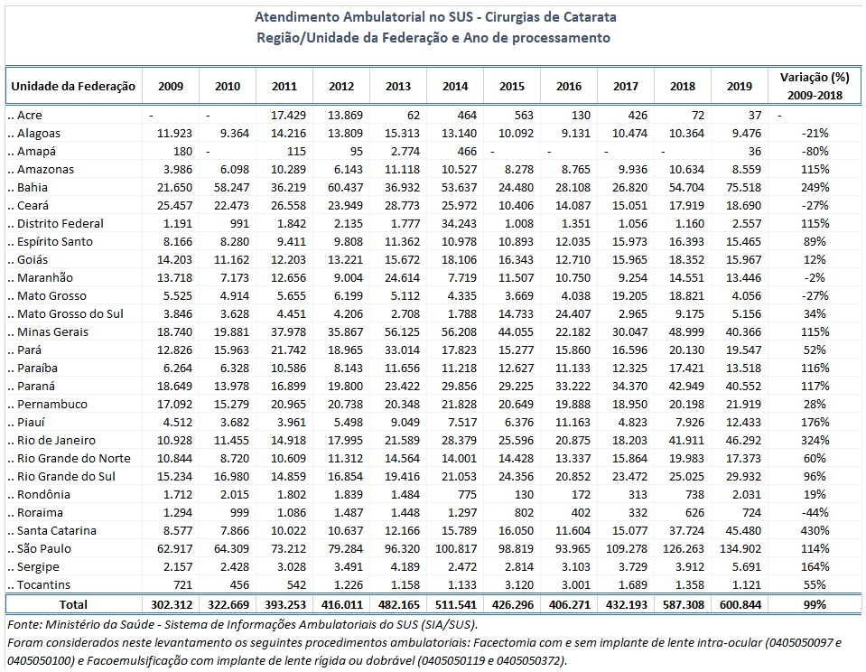 Os dados analisados se referem à produção realizada pela rede pública entre janeiro de 2009 e dezembro de 2019. As informações referentes a 2020 ainda estão sendo avaliadas e devem alimentar outro trabalho, no qual será possível medir o impacto da pandemia de Covid-19 nos atendimentos em oftalmologia, em especial no que se refere ao tratamento de catarata.