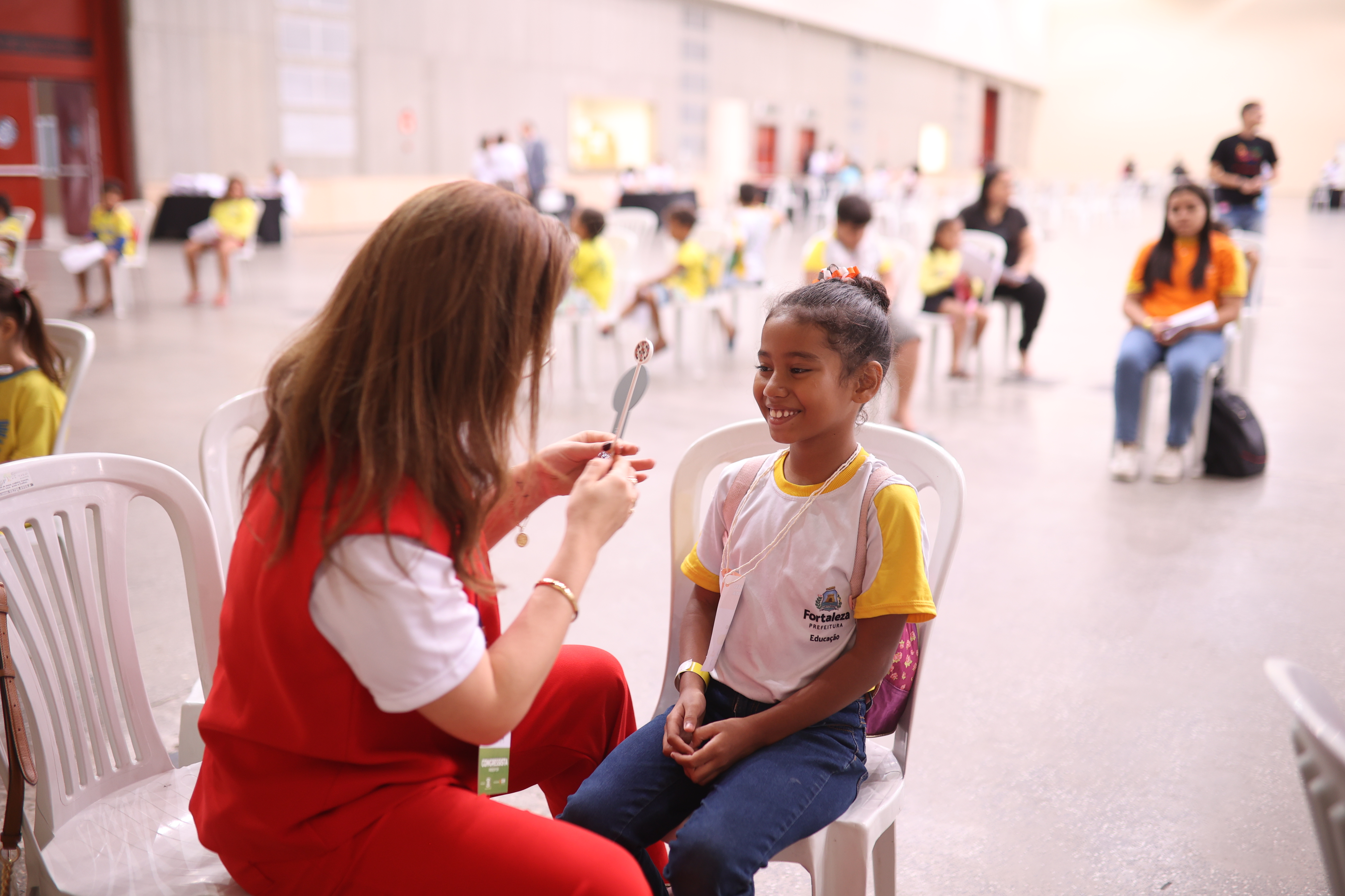 Se no Pavilhão Oeste do Centro de Eventos do Ceará a movimentação era típica de um congresso da área da saúde, com profissionais circulando pelos estandes e salas de palestras, no lado oposto, no Pavilhão Leste, o cenário era bem diferente. Gargalhadas, animação e muito carinho preenchiam o salão do local, onde aconteceu a ação social Pequenos Olhares, promovida pelo 67º Congresso Brasileiro de Oftalmologia.